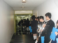 (左)(中)出番を待つ出演者たち。恐ろしく長い列が出来上がっていました。(右)「集い」実行委員長でもあり、最終演奏グループの指揮を務められた橘田誠司先生。「最後まで満席のお客さんがいるのは湘南地区だけですよ。そこをアピールしておいて下さいね」とのことでした。