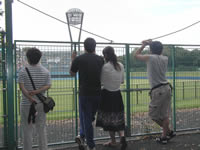 | 左)試合終了後、「想い」を託して折鶴を渡す麻溝台の秋里主将(君、キャプテンだったのか....!) 中・右)今年もいました。平塚球場の柵越しに「ただ見」するおじさんたち。一応「学校関係者の方ですか?」と尋ねてみたが、勿論答えは「いいえ」 | |||||