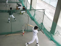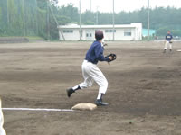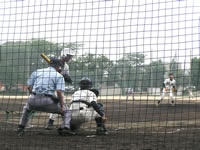 昨夏からのエース、水野崇裕くん(3年)はシャイな少年。しかし、ひとたびボールを握ると、上背を利して剛球を投げ込む。 管理人は、彼がブルペン(というか、グラウンドの端っこに設けられたマウンド)で投げるボールを自分がバッターボックスに入ることをイメージしつつ、真後ろから見させてもらった。 ...こ、恐い。こりゃ、当たったら死ぬ。 |