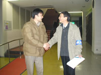 | ハーフタイム。我々の隣で観戦していたお二人の話から(盗聴していたわけではないのですが)、どうやら近隣の中学のバスケット部顧問の先生ではないかと推察。ちょっとお話を伺ってみました。 写真左は、赤羽根中バスケット部顧問の木村先生。センターの今井さんなど、北陵にも好選手を送り出している。 |