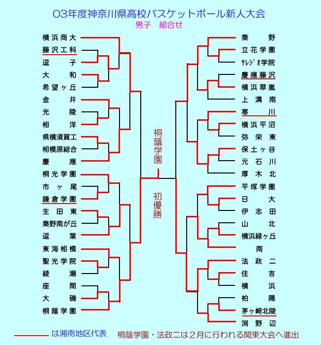 | 04年1月10日より開催されるバスケット新人戦県大会。男女とも組合せが決定したので、ご報告まで。 |